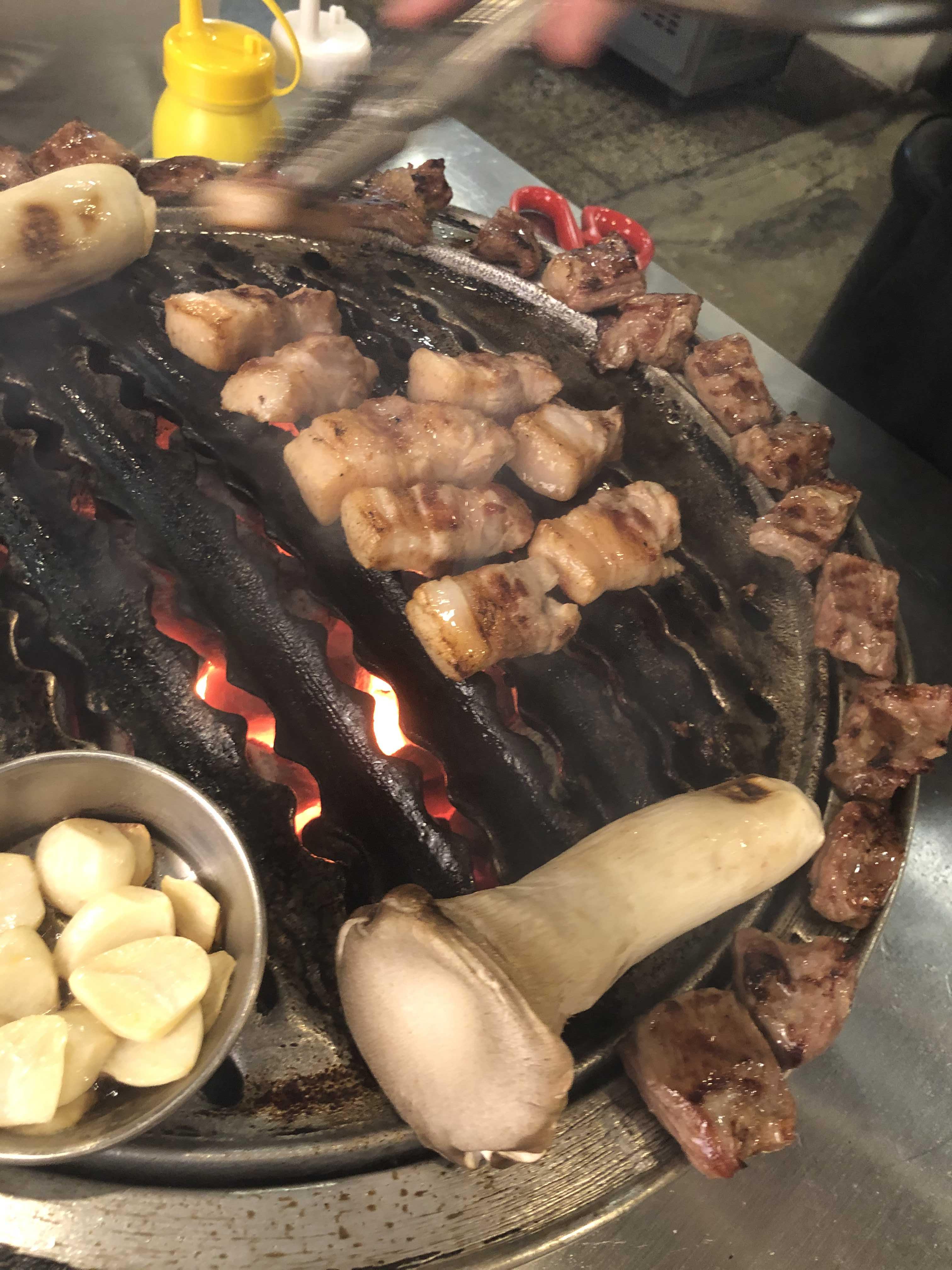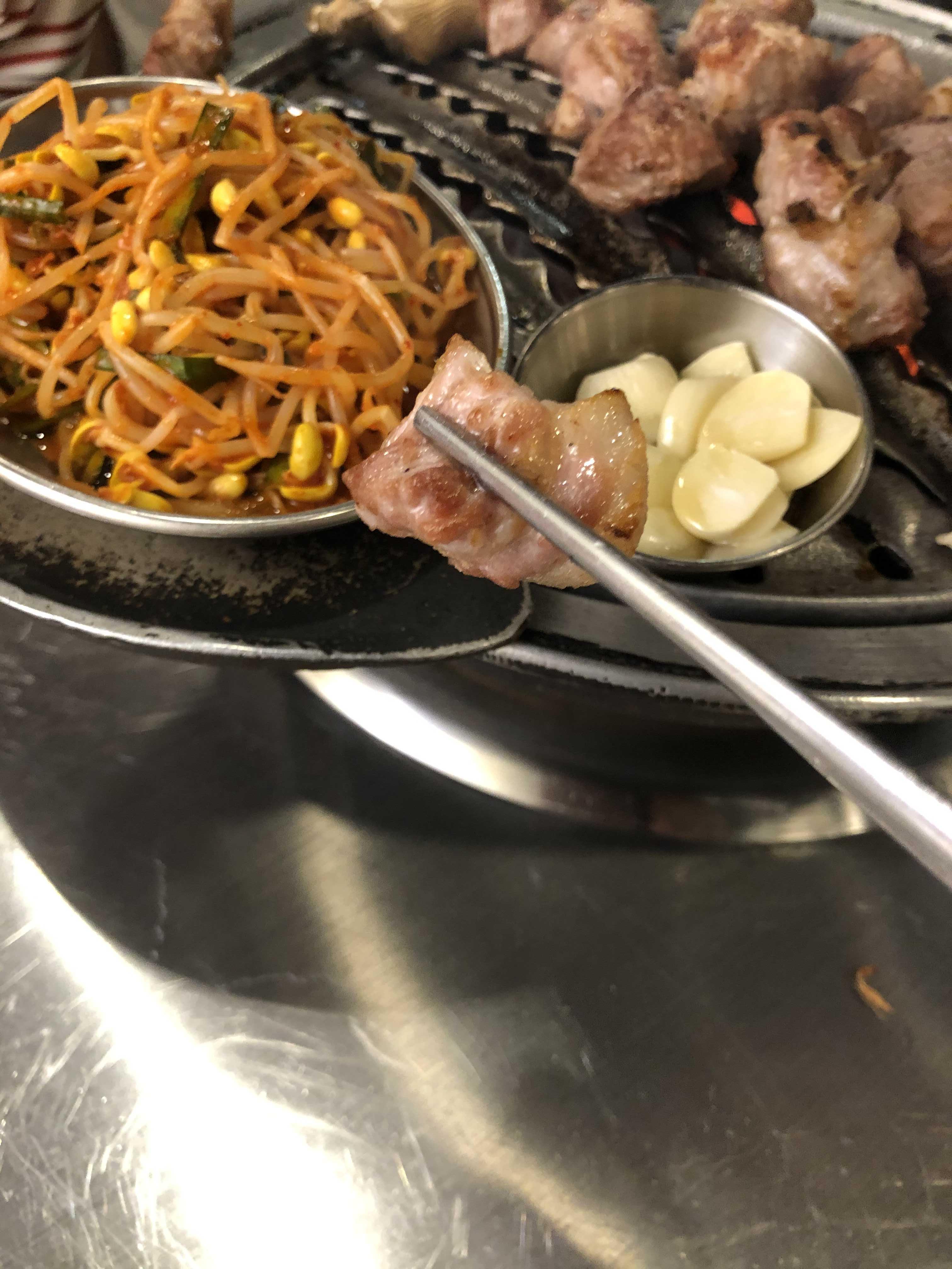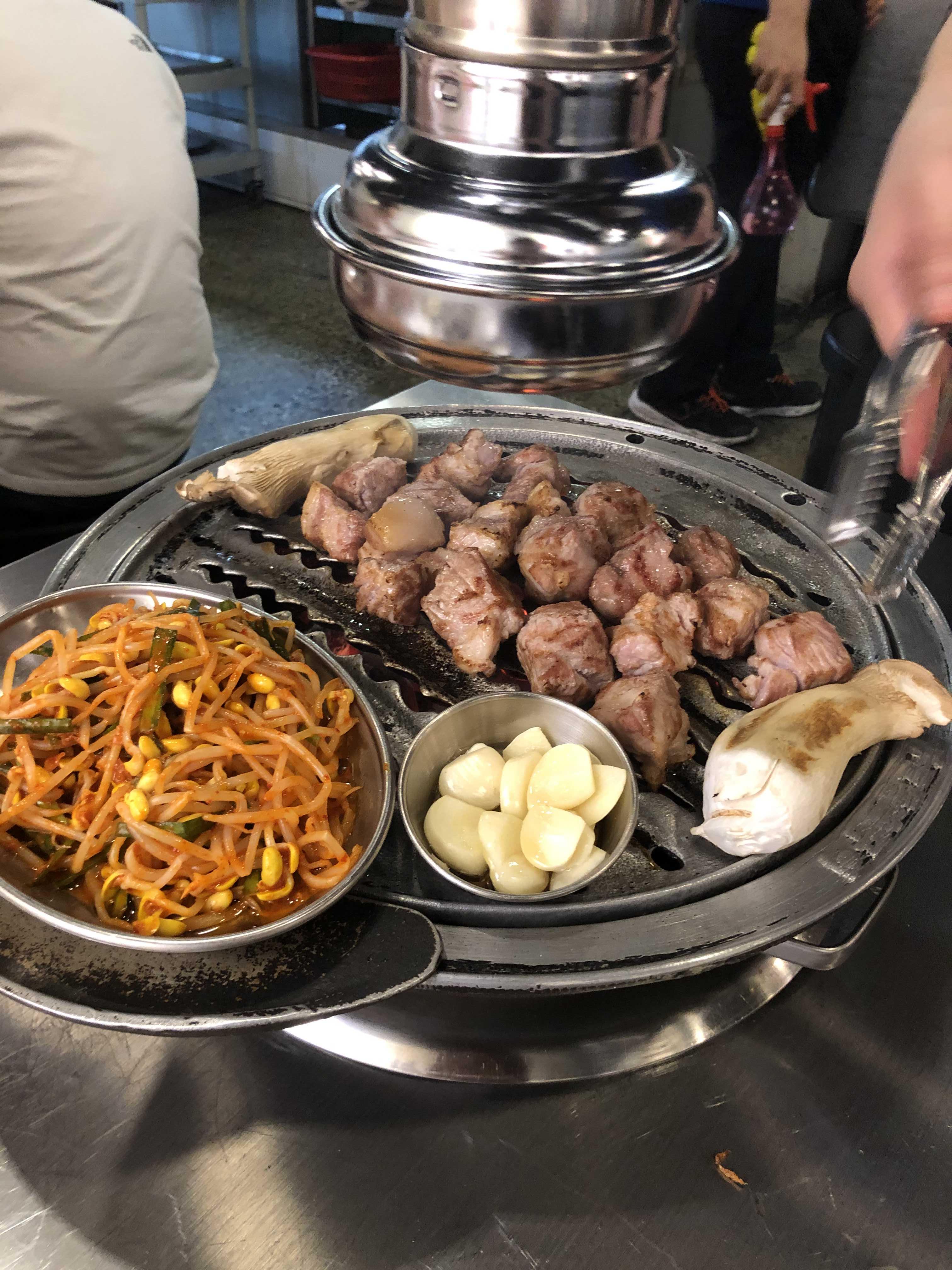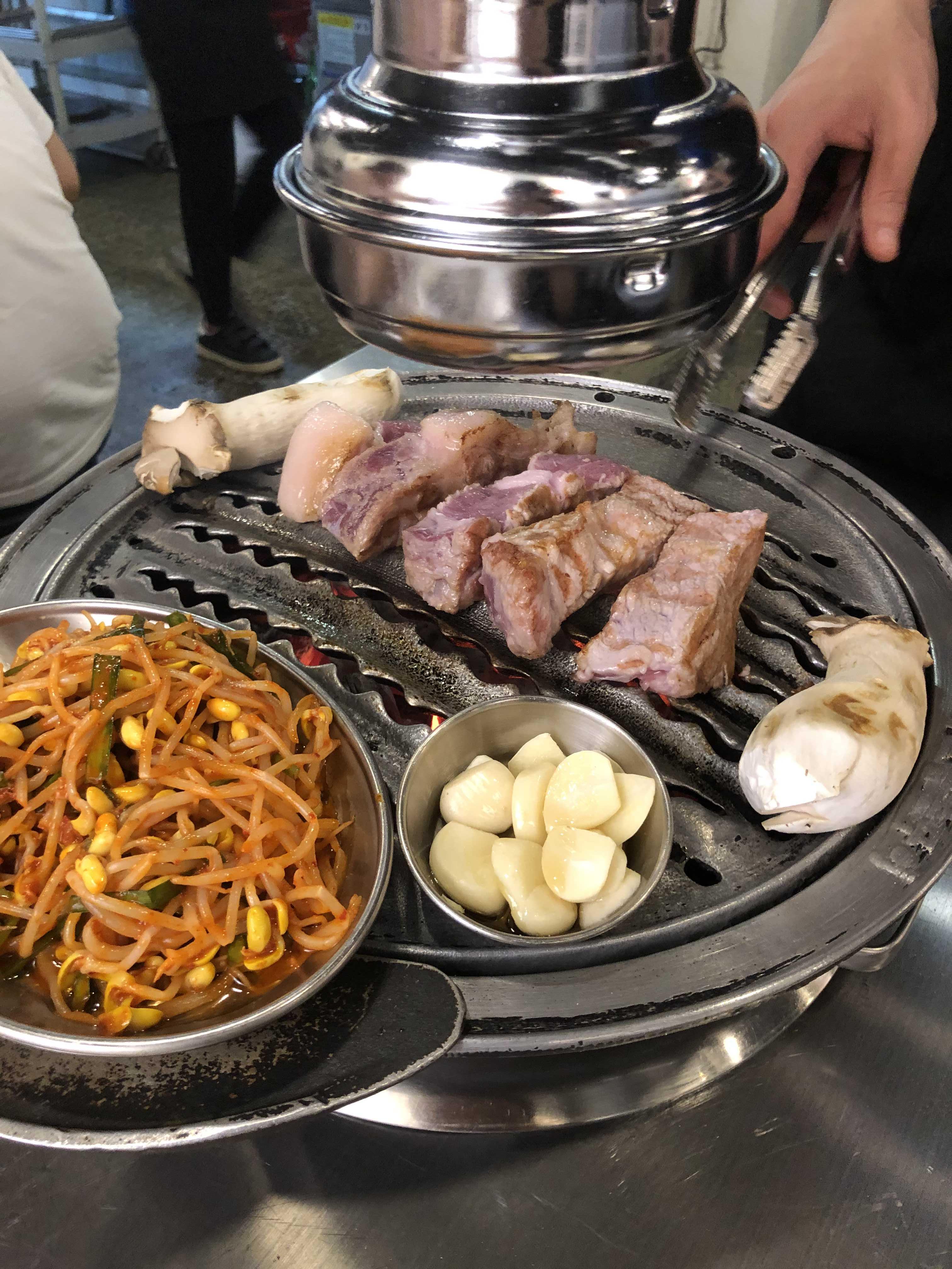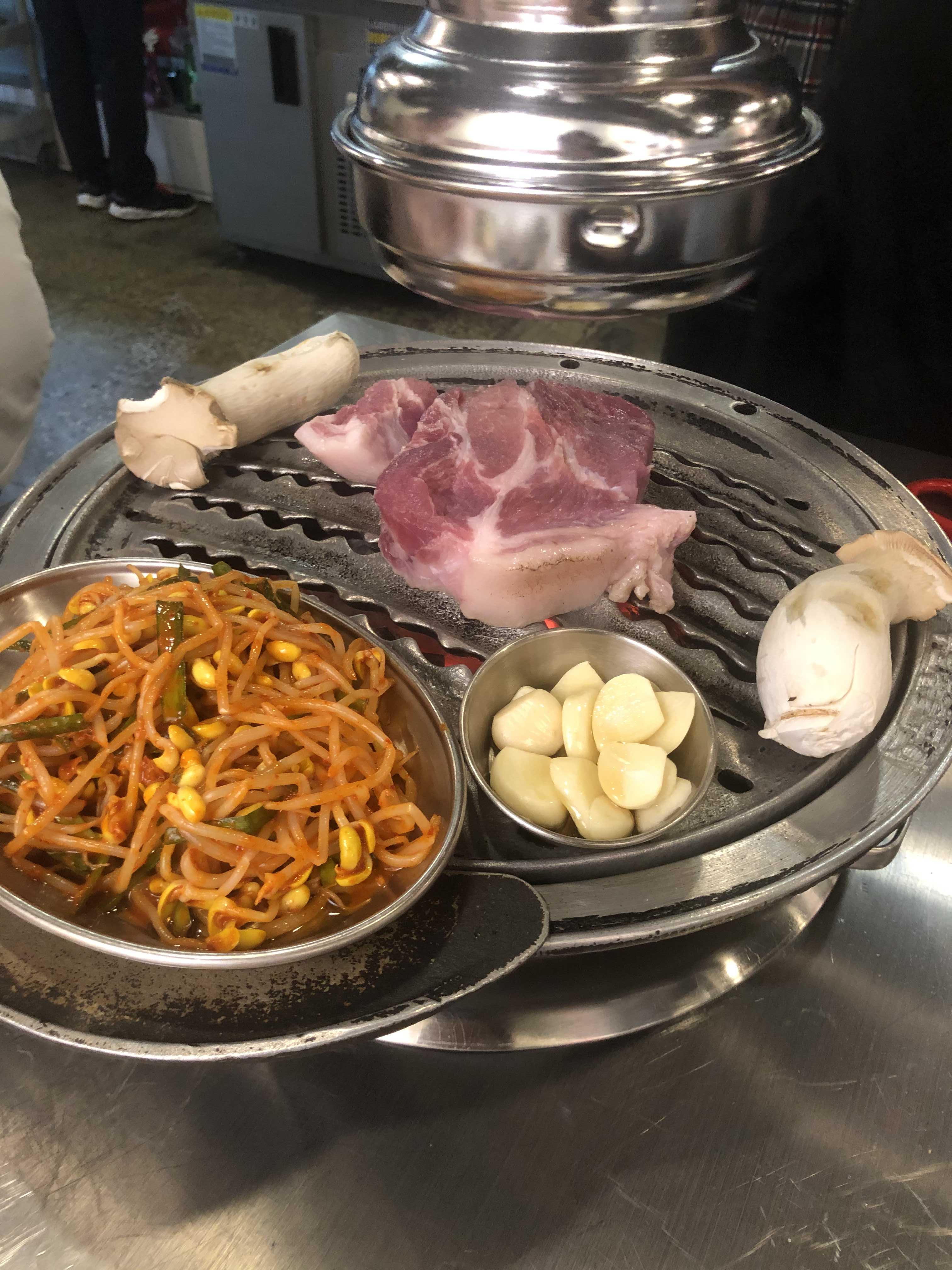 기본 불판 세팅 모습입니다! 기본적으로 마늘+참기름과 콩나물 밑에는 김치가 깔려 있어요!