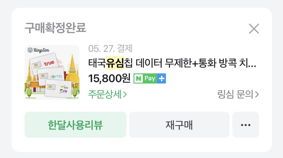 내가 듣기로는 태국에서 e-sim을 이용하는것이 조금은 위험하다는 이야기를 들어서 유심으로 구매해서 가기로 결정했다.